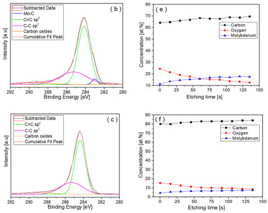 In addition, information about the bonding state of the Mo was investigated (Table 2). The distribution of molybdenum, carbon, and oxygen versus etching time in the Mo-DLC films is presented in Figure 7. The XPS data indicated that the oxygen content on the surface of the Mo-DLC films was higher compared to the bulk oxygen concentration (Figure 7d–f). These data indicated that oxygen could rise due to the exposure of coatings to the atmosphere after deposition and due to possible residual oxygen in the vacuum chamber during the coating deposition process. The concentration of oxygen on the surface of Mo-DLC3 was 24.4 at.%. The oxygen content decreased proportionally from 24.4 at.% at the sample’s surface to about 14 at.% after 100 s of etching. Meanwhile, the carbon and molybdenum concentrations increased and became stable after 75 s of etching (Figure 7e). It should be noted that the Mo concentration varied from 14 to 17 at.%, which was higher than the Mo concentration obtained by the EDX measurement. A reduction in the oxygen concentration from 11.4 at.% to 6.3 at.% was observed with an increase in the etching time up to 90 s for the Mo-DLC2 film. The further increase in the etching time up to 135 s led to a slight variation in oxygen content between 6.2 at.% and 6.0 at.% in the film (Figure 7).