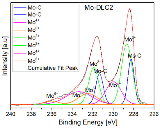 The Mo 3d core level spectrum between 225 and 238 eV reveals the presence of many Mo sites within the film (Figure 8). The Mo 3d spectra exhibited two main peaks at ~228.8 eV and 232.0 eV, attributed to the 3d5/2 and 3d3/2 core levels [17,29]. The spectra of the Mo-DLC films were divided into four distinct peaks at 228.3 ± 0.1 eV, 228.7 ± 0.1 eV, 229.3 ± 0.3 eV, and 232.4 ± 0.1 eV (Table 2). The peak at 228.4 eV is ascribed to a molybdenum carbide (Mo–C) bond. The bonds of molybdenum oxides are generally observed at 227.8 eV for Mo2+, 228.7 eV, 229.4 eV, and 232.2 eV for Mo4+, and 232.6 eV and 235.4 eV for Mo6+ [8].