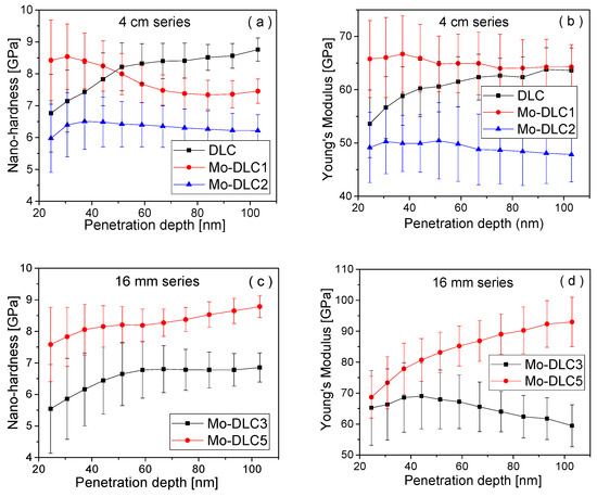 The Young’s modulus slightly increased from 60.5 up to 65 GPa as the Mo concentration further increased. The nanohardness and Young’s modulus values of the Mo-DLC2 film are 6.3 GPa and 49 GPa, respectively. The hardness value slightly increased to 6.5 GPa when the Mo content in the film was enhanced to 10.3 at.%. Additionally, the Young’s modulus of the Mo-DLC3 film was ~65 GPa (Figure 9c). The slight increase in the nanohardness of the Mo-DLC3 films could be related to the formation of a higher content of the Mo–C phase. The reduction in the synthesis temperature to 225 °C improved the nanohardness to 7.41 GPa. The increase in the deposition distance to 8 cm reduced the deposition temperature to 180 °C, and led to the growth of the Mo-doped DLC film with hardness and Young’s modulus values of 8.2 and 83.7 GPa, respectively (Figure 9d). Compared with the Raman results, for the first four films (deposited at 235 °C), the increase in Mo doping from 0 to 10.3 at.% (Table 1) led to an increase in ID/IG ratio from 0.96 to 1.15 (Figure 6e). The change is assigned to a lower sp3 C–C content and formation of a higher fraction of sp2 C=C sites, which is consistent with the nanohardness results, indicating the decrease in hardness from ~8.0 to 6.5 GPa (Table 3). This consistency applies to the second series of films deposited at 16 mm slit opening width, where the ID/IG ratio distinctly decreased from 1.15 to 0.61 (Figure 6f). This change in the microstructure was reflected in an augmentation in nanohardness from 6.49 GPa to 8.24 GPa, respectively (Table 3). The enhancement of the synthesis temperature causes the rearrangement of sp3 bonds to sp2 bonds, which leads to an increase in the ID/IG ratio and the growth of Mo-DLC films with lower nanohardness.