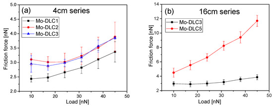 The friction force on the Mo-DLC film surfaces was assessed based on the applied loads, ranging from 10 nN up to 45 nN, and is presented in Figure 10. The friction force for all coatings was observed to increase proportionally with the applied load. For the films deposited at 235 °C, as the applied normal force increased, the friction force slightly rose from 2.4 to 3.3 nN for the Mo-DLC1 film (Figure 10a). An analogous tendency was obtained for the films with higher Mo content (Mo-DLC2 and Mo-DLC3).