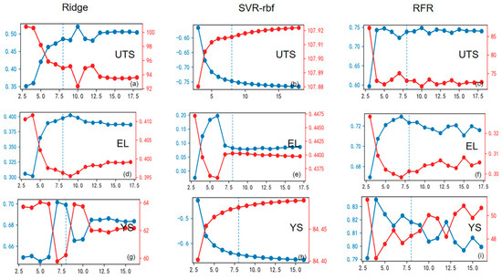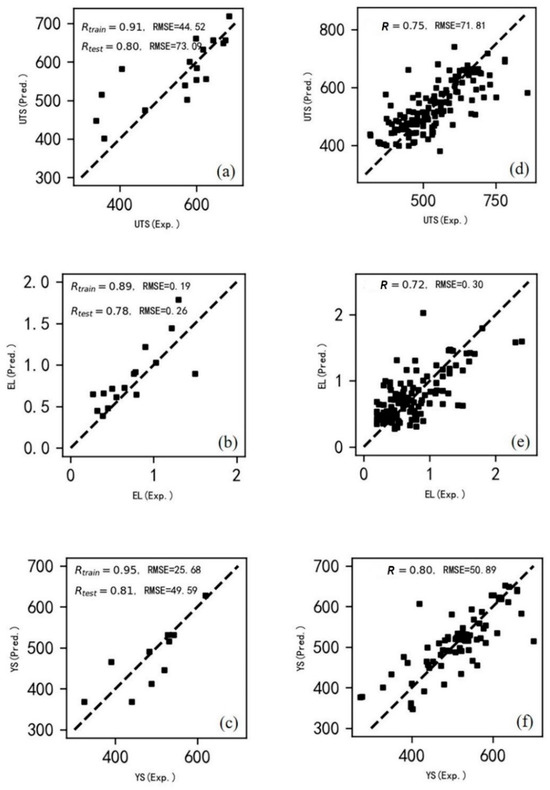 - To assess the performance of the developed RFR model and mitigate the risk of overfitting, LOOCV was performed concurrently on the training set. It was revealed that the discrepancy in R values between the independent test set and the LOOCV on the training set was about 0.05, suggesting that all three well-trained models for UTS, EL, and YS exhibit relatively good predictive capabilities.