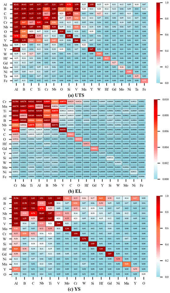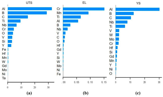 - The RT UTS of cast TiAl alloys was mainly influenced by Al, B, C, Ti, Nb elements and so on, where the positive elements for UTS mainly included B, C, Nb, O, and Y, while the negative elements mainly contained Al, Ti, Cr, V, Si, and Fe. The RT EL of cast TiAl alloys was mainly influenced by Cr, Mn, Ti, Al, B elements and so on, where the positive elements for EL mainly included Cr, Mn, Al, and V, while the negative elements mainly contained Nb and C. The RT YS of cast TiAl alloys was mainly influenced by Al, B, C, Nb, Ti elements and so on, where the positive elements for YS mainly included B, C, and Nb, while the negative elements mainly contained Al, Ti, V, W, and Mo.