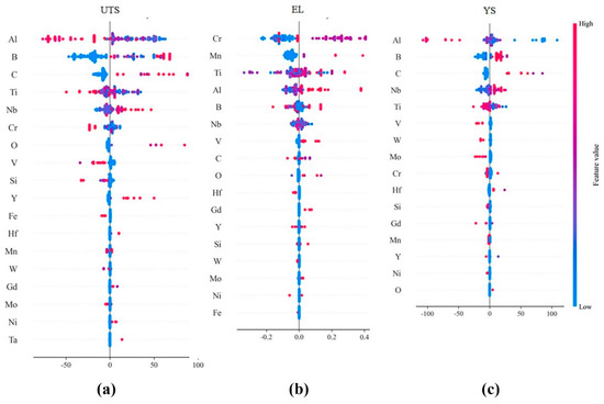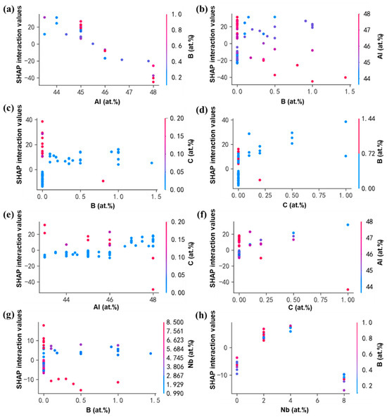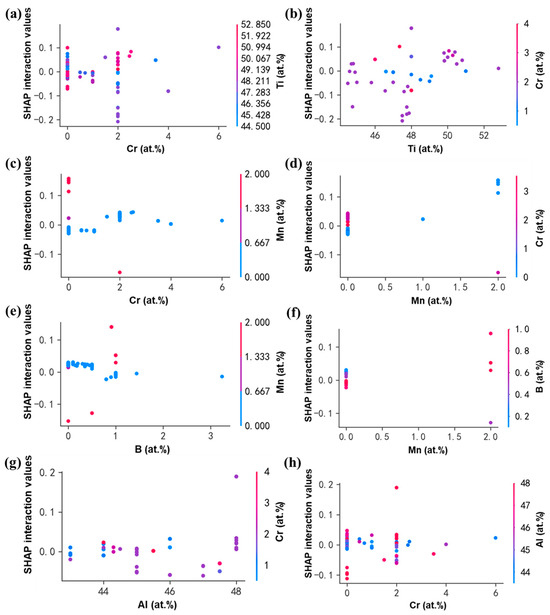 - The highly probable interaction direction between two different elements on the RT tensile properties of cast TiAl alloys was basically unveiled by analyses of the SHAP dependence plots. Such as, when the Al content is less than about 45.5 at%, the interaction between Al and B elements is usually positive for the UTS; when the Cr content is more than about 1 at%, the interaction between Cr and Mn elements is generally positive for the EL; when the Al content is 44–46 at%, the interactions between Al and B, as well as between Al and C elements, are generally positive for the YS.