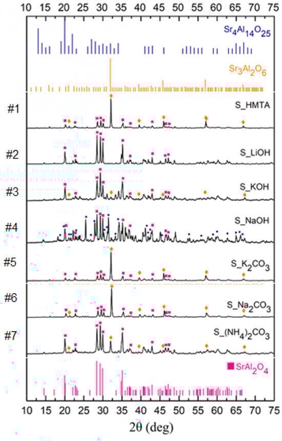 Figure 1 displays the XRD patterns of the same samples after thermal treatment at 1200 °C. During microwave heating, Sr and Al precursors form various compounds with low solubility in water, such as oxides, hydroxides, carbonates and oxyhydroxides, depending on the used precursors [7]. To obtain SrAl2O4, the resulting powders have to be annealed at higher temperatures, therefore, the ratio of Sr, Al, O, and dopants is dependent on the composition obtained before the annealing. The results show that, in all cases, monoclinic strontium aluminate (SrAl2O4) was formed. However, most samples also showed the presence of additional cubic strontium aluminate (Sr3Al2O6) and hexagonal strontium aluminate (Sr4Al14O25) phases. Based on the XRD data, it appears that the formation of monoclinic SrAl2O4 is favored in systems where strong bases—LiOH, KOH, and NaOH—are used for precipitation of metals (Figure 2).