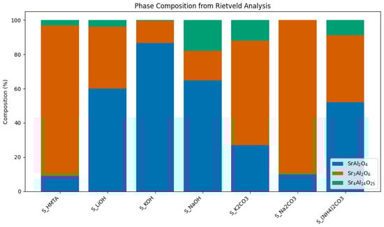 In contrast, samples synthesized using carbonate precursors such as Na2CO3 and K2CO3, or HMTA, primarily formed cubic strontium aluminate (Sr3Al2O6) after calcination. Interestingly, the sample prepared with ammonium carbonate ((NH4)2CO3) contained nearly equal proportions of both SrAl2O4 and Sr3Al2O6 phases. The observed effect may be associated with the formation of metal carbonate intermediates during microwave heating, as both carbonates and HMTA produce CO32− ions by dissolving carbonate salts or by heating decomposition of HMTA.