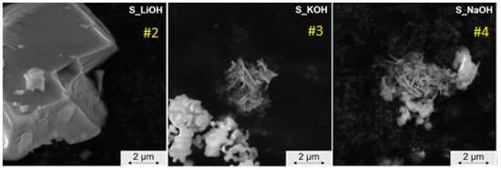 SEM images (SE mode) of samples synthesized using hydroxide precursors (LiOH, KOH, NaOH) after annealing.