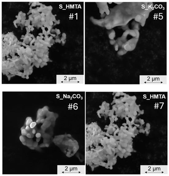 SEM images (SE mode) of samples synthesized using carbonate precursors (K2CO3, (NH4)2CO3, Na2CO3) and HMTA after annealing.