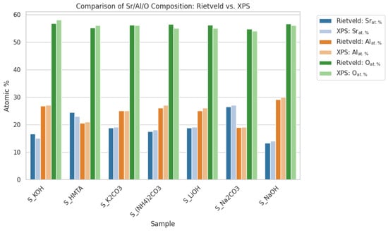 X-ray photoelectron spectroscopy (XPS) was performed on the samples, acquiring both wide-range survey spectra to determine overall elemental composition and high-resolution narrow scans of individual elements. The survey spectra analysis revealed different atomic percentages of Sr, Al, and O, confirming the presence of multiple phases in the sample. In Figure 5 is the comparison of the bulk phase composition determined by Rietveld refinement with the surface composition measured by XPS for a series of samples. For the Rietveld data, the phase percentages of Sr3Al2O6, SrAl2O4, and Sr4Al14O25 were used along with their stoichiometric ratios to calculate the overall atomic percentages of Sr, Al, and O. Calculated values were then directly compared to the corresponding XPS survey results. The results demonstrate that, although there are differences in the absolute values due to the surface sensitivity of XPS versus the bulk nature of the Rietveld analysis, the overall trends in the elemental ratios are consistent across the samples.