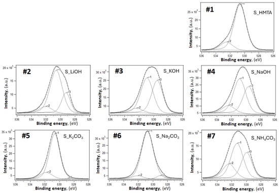 From the narrow scans, the most interesting case was the high-resolution O 1s narrow scan (Figure 6). It revealed that the O1s spectra in these samples can be de-convoluted into multiple components. In most cases, the primary component—at an effective maximum near 530.6–530.9 eV with FWHM values around 1.7–2.0 eV—is attributed to lattice oxygen in the strontium aluminate matrix, which is consistent with literature values for oxide materials [18,19,20]. Samples like S_NaOH and S_NH4CO3—which have a high fraction of SrAl2O4 according to the phase analysis—consistently show a prominent component at approximately 532.4–532.5 eV. In contrast, samples dominated by Sr3Al2O6, such as those prepared with K2CO3 and Na2CO3, exhibit a main peak near 530.6–530.9 eV. Additionally, a lower binding energy component, typically in the 529–530 eV range, is observed in several samples (NaOH, LiOH, and KOH) and may be linked to a minor phase or a defect-related oxygen species. These differences in effective peak positions and their relative areas suggest that each oxygen environment—in lattice oxygen of SrAl2O4 versus Sr3Al2O6 and the minor contribution from Sr4Al14O25—is reflected in a slight shift of the O 1s binding energy.