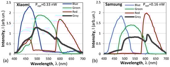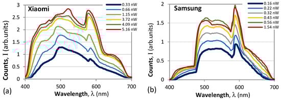 Overall spectral responses of the smartphones vs. optical power increase: (a) Xiaomi 11T Pro; (b) Samsung Galaxy A51.