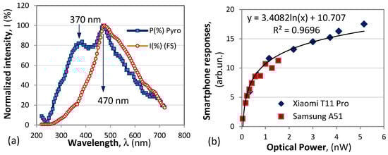 (a) Normalized power spectral distribution of the white light source as measured by a pyroelectric probe and the fiber spectrometer; (b) responses of the Xiaomi 11T Pro and Samsung Galaxy A51 vs. absolute optical power at 500 nm.