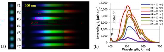 We first illuminated the linear array with the samples with a 400 nm LED whose light is focused along a line using a glass rod and observe simultaneously the individual phosphorescence and the corresponding spectra. Since the spectra of the samples are in the blue-green range, we prefer the Xiaomi 11T Pro smartphone whose transmission spectrum exhibits weaker irregularity. In Figure 12a, we show the images of the seven samples and their spectra as obtained with the smartphone. As seen, the colors of the phosphorescent samples (#1 to #7) are different and correspondingly so are their spectra, shown to the right. Figure 12b presents the spectral distributions derived from the spectra in Figure 12a. As the excitation and the simultaneous measurement conditions are identical, we can correctly compare the spectra. As seen, sample #3 exhibits the strongest phosphorescence followed by #7, while #4 exhibits the weakest. Sample #1 exhibits medium intensity, while the rest ranked as follows: #2, #5, and #6. Both visibly and by distribution, the samples are different.