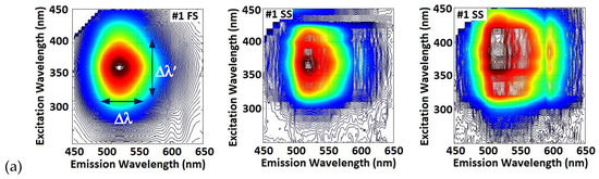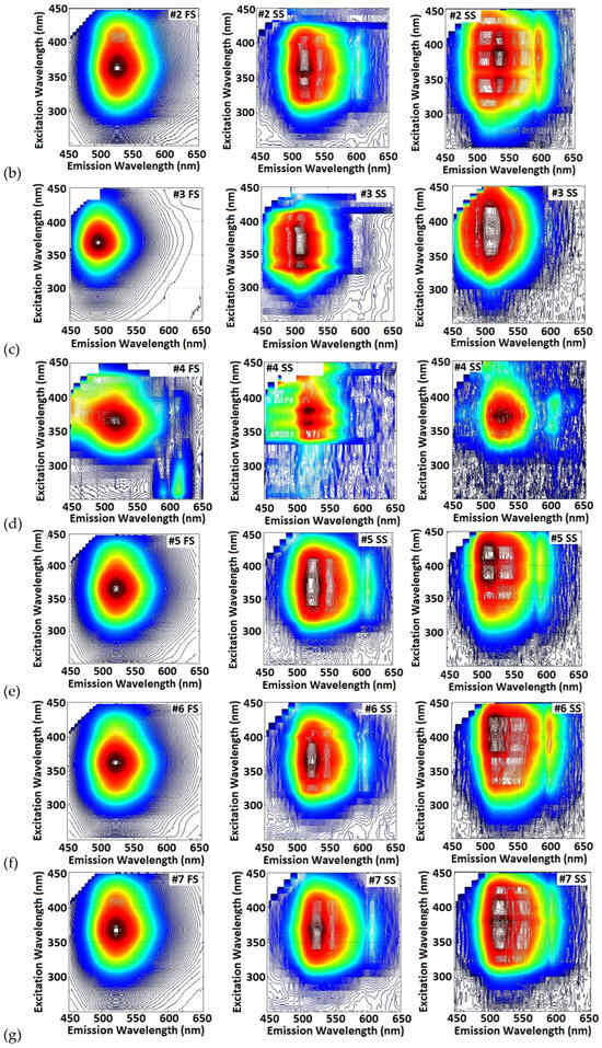 Topographic view of the 3D excitation emission luminescence spectra as measured by the fiber spectrometer (FS)—left images and by a smartphone spectrometer (SS)—middle and right: (a) #1; (b) #2; (c) #3; (d) #4; (e) #5; (f) #6; (g) #7.