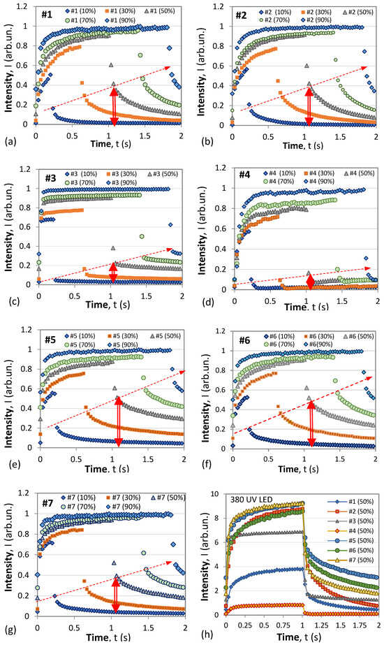 Rise/decay time responses for five different duty cycles for 380 nm LED excitation. The double arrow indicates the ΔuOFF(t0) level: (a) #1, (b) #2, (c) #3, (d) #4, (e) #5, (f) #6, (g) #7 and (h) comparison of all the responses for a duty cycle of η = 50%.