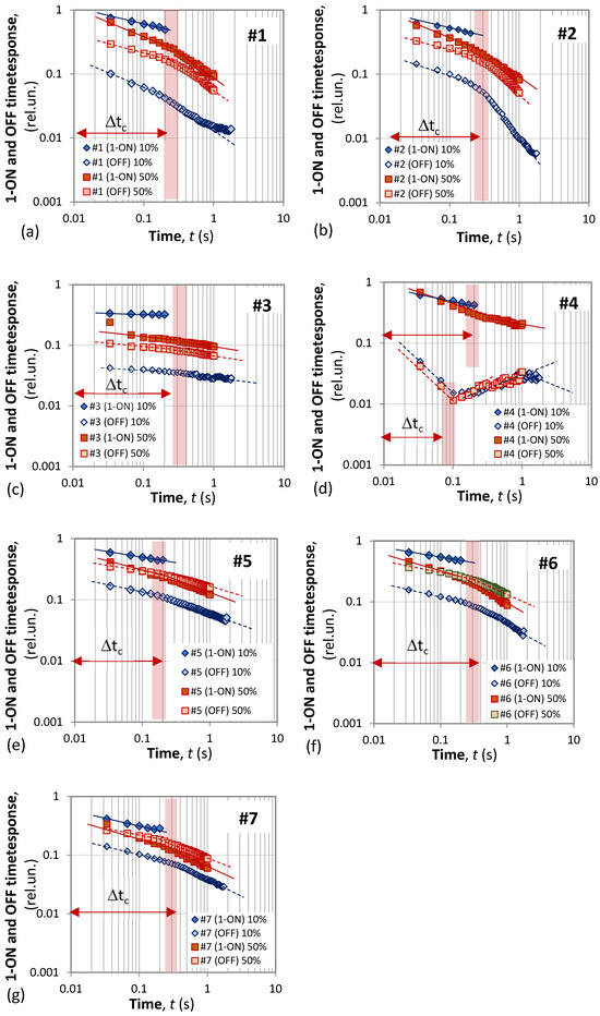Double log plots of 1-uON(t) and uOFF(t) for η = 10% and η = 50% at room temperature and 380 nm LED excitation: (a) #1, (b) #2, (c) #3, (d) #4, (e) #5, (f) #6, (g) #7.