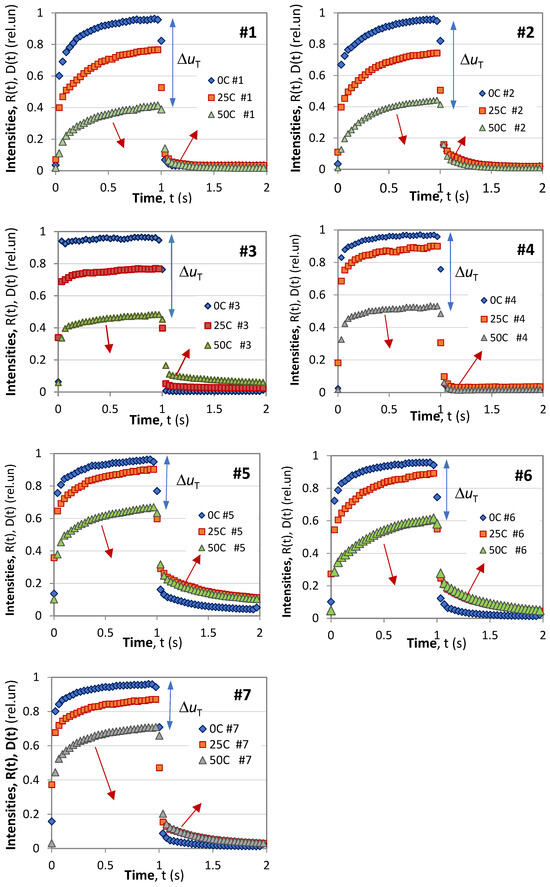 In Figure 14a–g, the double red arrow indicates the phosphorescence level ΔuOFF for η = 50%, i.e., the relative share of phosphorescence of the sample, while the dashed arrow indicates the rise of this relative share as the duration of the excitation increases with the duty cycle.