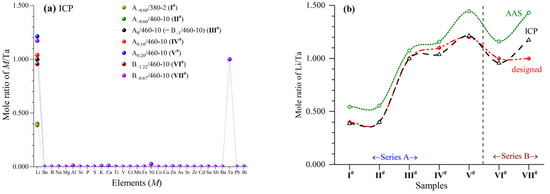 The ICP (a) and AAS (M = Li, Be, B…) (b) results of seven representative samples I#−VII# derived from series A (Li1+xTaO1+xCl4−x, x = −0.60, 0, 0.10, and 0.20) and B (LiTaO2+yCl2−2y, y = −1.22, −1, and −0.67) calcined at 380−460 °C for 2−10 h.