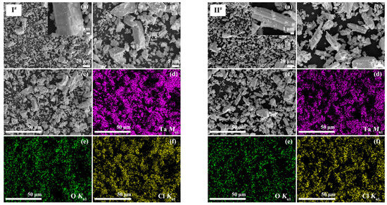 SEM images (I#(a,b)–VII#(a,b)) and EDS elemental mappings (1 k×; I#(c,d)–VII#(c,d)) are shown in Figure 2. The morphology of the powders varied from strips to irregular nano/microparticles. There were more thicker strips and coarser blocks in the lower-temperature and shorter-time calcined powder (I# @380 °C × 2 h) than in the higher-temperature and longer-time calcined powders (II#–VII# @460 °C × 10 h). Changes in particle shape caused by chemical composition were very small among series A (II#–V# @460 °C × 10 h) and B (VI#–VII# @460 °C × 10 h). Elements of Ta, O, and Cl were distributed homogeneously in all particles.