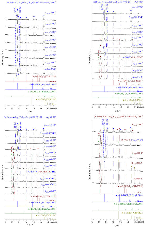 In series A, samples A−0.70~0/260-2#, A−0.70~−0.10/380-2#, and A−0.70~−0.40/460-10# were obtained via reaction Equation (8), while m-LiTaOCl4 was the main phase. In other words, these samples had matching nominal-realizable compositions and belonged to LiTaOCl4-type SSEs.