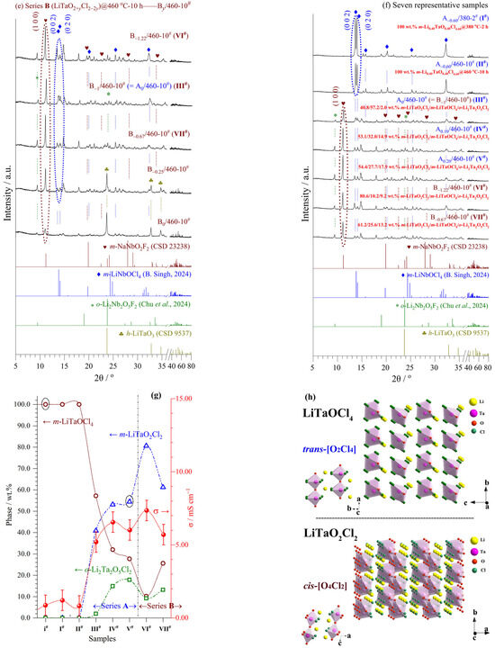 XRD patterns of samples Ax/T-D# and By/T-D# derived, respectively, from series A (Li1+xTaO1+xCl4−x, −0.70 ≤ x ≤ 0.50; ±|x| indicate respectively over-/under-lithiated values) and B (LiTaO2+yCl2−2y, −1.22 ≤ y ≤ 0; ±|y| indicate peroxy-/anoxic values) prepared at different calcining temperatures (T = 260−460 °C) and dwell times (D = 2−10 h). (a) Series A @260 °C × 2 h; (b) series A @380 °C × 2 h; (c) series A @460 °C × 10 h; (d) series B @380 °C × 2 h; (e) series B @460 °C × 10 h; (f) seven representative samples I#−VII# @380−460 °C × 2−10 h; (g) phase contents and ionic conductivity (σ) (see later in Section 3.4), in which structures of cycle-marked samples were refined as CSD 2428209/2428866 [28,29]; (h) refined crystal structures of m-LiTaOCl4 and m-LiTaO2Cl2. I#—A−0.60/380-2#, II#—A−0.60/460-10#, III#—A0/460-10# (= B−1/460-10#), IV#—A0.10/460-10#, V#—A0.20/460-10#, VI#—B−1.22/460-10#, and VII#—B−0.67/460-10# [15,24].