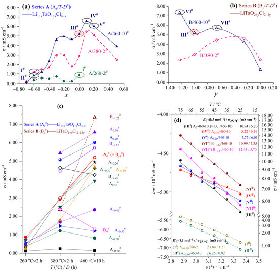 (a) Ionic conductivity (σ) dependence on composition of series A (Li1+xTaO1+xCl4−x, −0.70 ≤ x ≤ 0.50); (b) The σ dependence on composition of series B (LiTaO2+yCl2−2y, −1.22 ≤ y ≤ 0); (c) The σ in relation to chemical composition, synthesis temperature (T = 260−460 °C), and dwell time (D = 2−10 h); (d) The σ and activation energy (Ea) dependence on temperature for seven representative samples. I#—A−0.60/380-2#, II#—A−0.60/460-10#, III#—A0/460-10# (= B−1/460-10#), IV#—A0.10/460-10#, V#—A0.20/460-10#, VI#—B−1.22/460-10#, and VII#—B−0.67/460-10#.