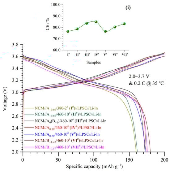 An ASSLIB (NCM//LTOC//LPSC//Li-In) was assembled with a dual-layer SSE in which the LTOC was taken from one of seven representative samples I#−VII#. The initial charge–discharge curves were obtained under cut-off voltages of 2.0–3.7 V at 0.2 C and 35 °C (Figure 5). Results showed that all ASSLIBs (using different SSEs) delivered large battery capacities from 159.8 to 179.9 mAh g−1, accompanying high initial Coulombic efficiencies (CEs) from 76.4% to 84.9% (inset i of Figure 5). The two series of SSEs in this work have great application potential for next-generation ASSLIBs.