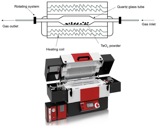 The oscillatory motion enabled increasing the contact surface area between the TeO2 powder and the reactive gas, hydrogen. The gas flow was controlled and monitored using a gas control system, and the hot output gas after the reaction was passed through a bottle of distilled water to be cooled down. The experimental setup is shown in Figure 2.