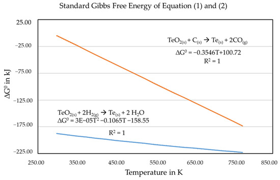 In addition to being environmentally friendly, hydrogen reduction also has the thermodynamic advantage over carbon as a reducing agent. A hypothesised hydrogen reduction of TeO2, producing Te and H2O, is expressed in Equation (1), and the ΔG0 is expressed by Equation (3). For comparison purposes, the carbothermic reduction of TeO2 is shown in Equation (2) and the ΔG0 in Equation (4). These Equations are obtained similarly from FactSage. Both reactions have confirmed the thermodynamic feasibility of the reaction, as well as the required temperature and its spontaneity. Despite the two possible pathways, the hydrogen reduction is shown to be more favourable thermodynamically (see Figure 4).