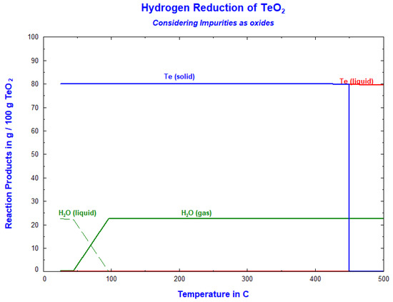 The hydrogen reduction in the TeO2, according to Equation (1), has been calculated for its possible product formation based on thermodynamic considerations, and the results are shown in Figure 5, which shows that the reaction between TeO2 and H2 can happen already at room temperature. At elevated temperatures up to 450 °C, common impurities including Pb, Bi, Cu, Se and Ag may form solid compounds with Te, such as PbTe, Bi2Te3, CuTe, and Ag2Te, that may contaminate the metallic Te.