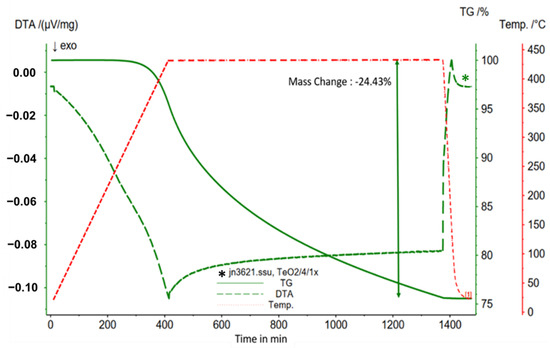Mass change (TG), DTA signal (DTA), and temperature (Temp.) of the TeO2 sample in relation to time.
