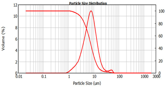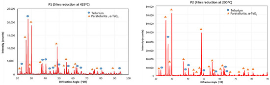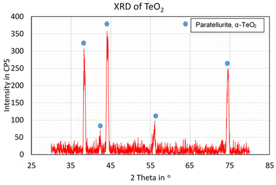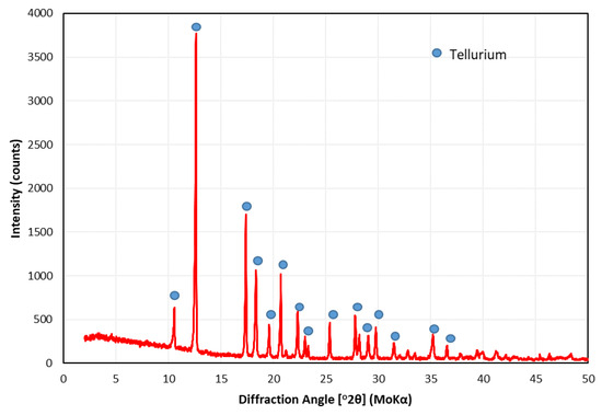 The chemical composition of the TeO2 powders can be seen in Table 2, as well as its XRD pattern in Figure 7. The TeO2 powders have a relatively high specific surface area of 0.453 m2/g and may enhance reaction kinetics in the reduction process. The uniformity index of 0.557 indicates moderate variation in the particle sizes that could help exclude low conversion due to differences in size. Detailed particle size distribution has been illustrated in Figure 8.
