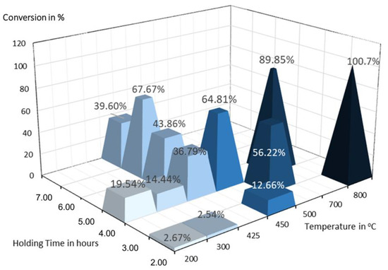 For further investigation, experiments were conducted at a temperature of 425 °C with holding times of 4, 5, 6, and 7 h. These parameters were chosen based on DTA-TGA results and practical experimental considerations. An expected increasing trend in the conversion was observed, rising from 36.79% at 4 h to 67.67% at 6 h.