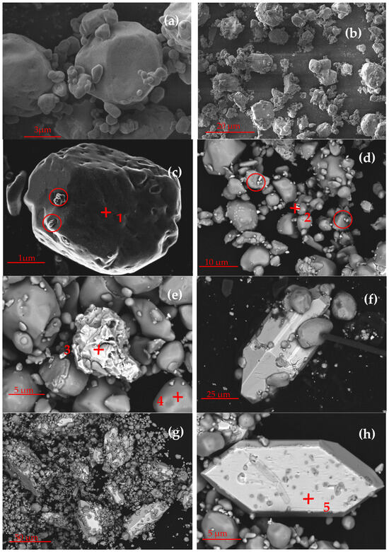 SEM images showing—(a) unreacted TeO2 particles at 20,000× and (b) 3500× magnification, (c) TeO2 particle with pore formation, shrinkage and reduced metal marked in red circle, (d) TeO2 particle with scattered Te nucleus marked in red circle, (e) clustering and nucleation of Te, (f) entrapment of oxide particles around the metal crystal, (g) clumps of oxide and crystals, (h) oxide-particle-free crystal with traces of gold powder for the SEM imaging.