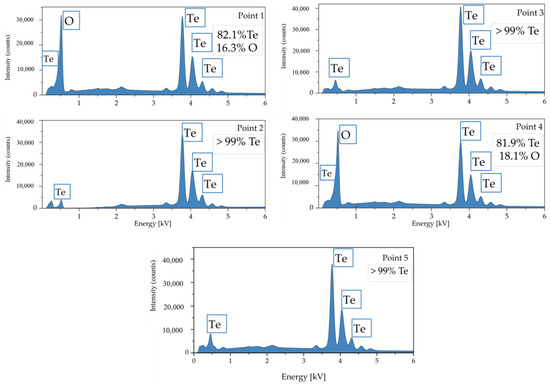 The XRD pattern includes two phases: TeO2 (Paratellurite) and tellurium (Te). The theoretical values according to Equation (6) were calculated to be 37.57% for P1 and 16.17% for P2, while the measured values were 43.5% (P1) and 18.1% (P2), respectively (compare Figure 13). Although there is a variation between the theoretical and measured values, the calculated error of approximately 15% and 12% is deemed to be within an acceptable range, considering multiple sources of error.