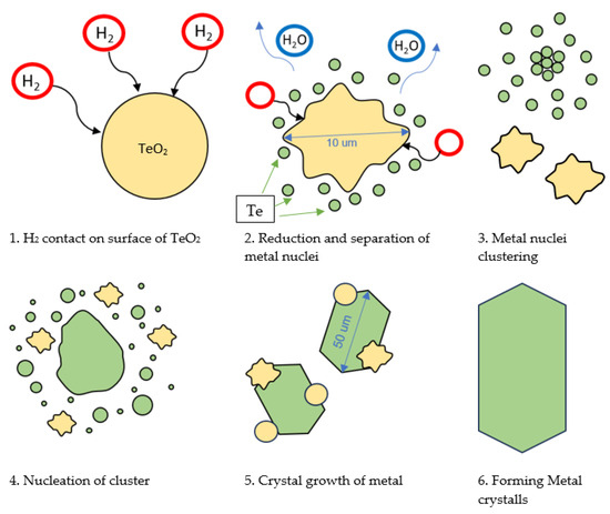 While hydrogen reduction of TeO2 for metallic Te is not a common target, the process is not entirely unprecedented. The kinetics of this reaction has been studied and characterised by Trawinski et al. with the aim of synthesising bismuth telluride (Bi2Te3) [29,36,37]. In that study, thermogravimetric analyses were conducted under non-isothermal conditions with heating rates varying between 2 and 6 K/min. The results suggested an optimal reaction temperature around 715K, i.e., slightly below the melting temperature of Te (723K). The authors proposed that the melting point might be even lower due to the nanoscale size of their Te particles. Furthermore, a thermal function was also obtained from the kinetic analysis, which calculated the activation energy to be 69.2 kJ/mol. Although the kinetic characterisation was aimed at synthesising Bi2Te3, the work established a foundation for scaling up the reduction process.