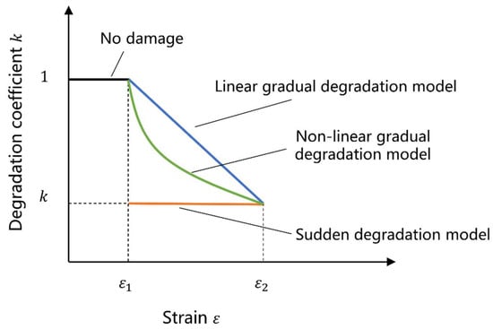 Damage evolution describes the rate of material stiffness degradation after reaching the corresponding damage initiation criteria. When the material satisfies the damage initiation criterion, the element is deemed to begin damage, losing its load-bearing capacity and experiencing stiffness degradation [35]. Figure 1 shows three degradation models for the mechanical properties of composite materials. The sudden degradation model represents that when composite materials reach a certain stress or strain threshold, their mechanical properties suddenly degrade; the linear gradual degradation model indicates that as stress or strain increases, the material’s load-bearing capacity decreases linearly, with a constant rate of performance degradation; the nonlinear gradual degradation model indicates that as stress or strain increases, the rate of capacity decrease gradually increases.