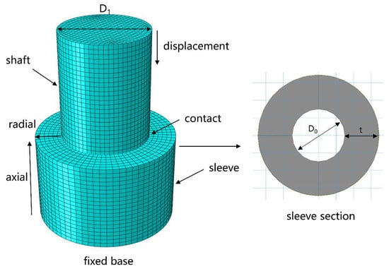 A three-dimensional finite element model of the interference-fit between the T800/924C composite material shaft and the TC4 titanium alloy shaft is established, as shown in Figure 2. The shaft height is 25 mm, the sleeve height is 20 mm, the inner diameter of the sleeve is 20 mm, and the sleeve has two layup sequences: axial and radial. The interference is altered by changing the shaft diameter. To effectively simulate the progressive damage process, the ABAQUS 2022 finite element analysis software is used to model the problem using explicit dynamics, employing the three-dimensional deformable solid C3D8R. Considering both computational time and result accuracy, the element size is selected as 1 mm.