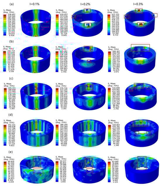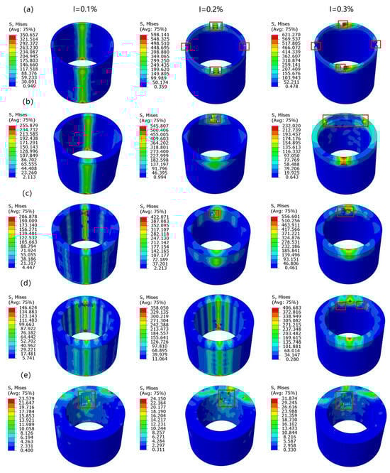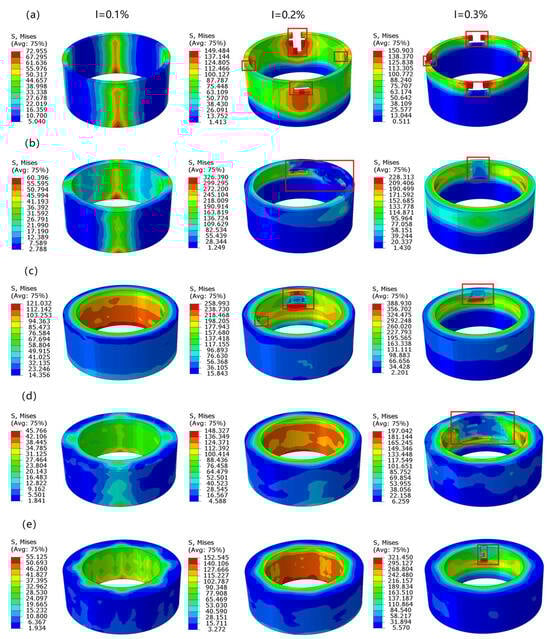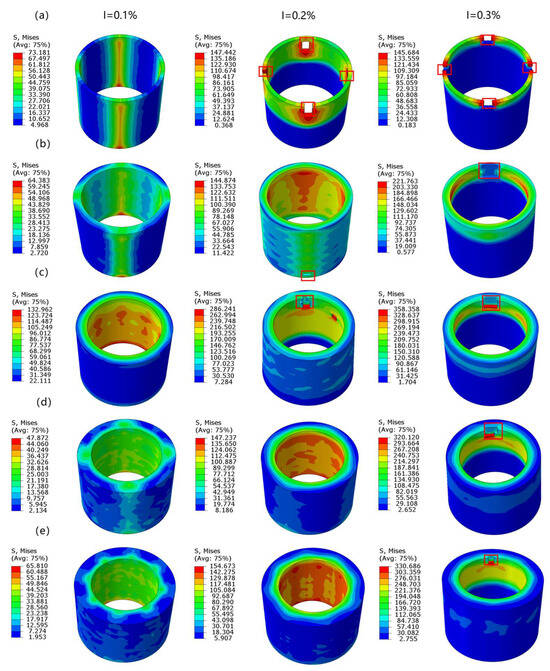 Damage conditions of the shaft-sleeve interference-fit model under different relative wall thickness δ (a) 5%, (b) 10%, (c) 15%, (d) 20%, and (e) 25% for the axial layup configuration of the sleeve when D0 = 40 mm, at I = 0.1%, 0.2%, and 0.3%. (Stress unit: MPa).