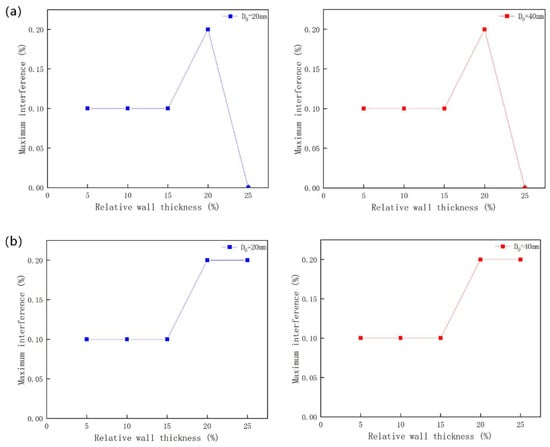 Figure 7 shows the variation in the maximum interference with relative wall thickness δ under axial and radial layups for two sizes = 20 mm and = 40 mm. It can be seen that, under axial layup, the maximum interference for both sizes reaches 0.1% when the relative wall thickness is 5%, 10%, and 15%; reaches 0.2% when the relative wall thickness is 20%; interference-fit cannot be achieved when the relative wall thickness is 25%. Under radial layup, the maximum interference reaches 0.1% when the relative wall thickness is 5%, 10%, and 15%; and reaches 0.2% when the relative wall thickness is 20% and 25%. These results validate the accuracy of the simulation results, indicating that, under two different layup methods, the maximum interference is uniquely determined once the relative wall thickness δ of the sleeve is fixed, regardless of the specific dimensions of the sleeve.