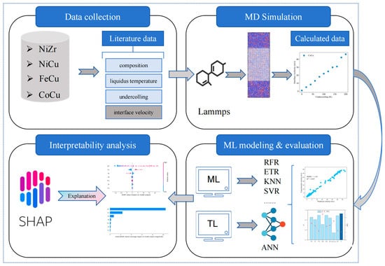 The workflow of this work is illustrated in Figure 1. It can be seen that this work consists of four parts. First, experimental data on the crystal interface velocity of four binary alloys were collected, including NiZr, NiCu, CoCu, and FeCu. Second, the dynamic solidification process of the four alloys was simulated using MD, and the interface velocity was calculated. Third, eight ML models driven by experimental data and a TL model driven by both physical information and experimental data were built. Subsequently, the interpolation and extrapolation capabilities of these two types of models were investigated. Finally, the influence of different features on the prediction of the interface velocity of dendrites was analyzed through interpretability analysis.