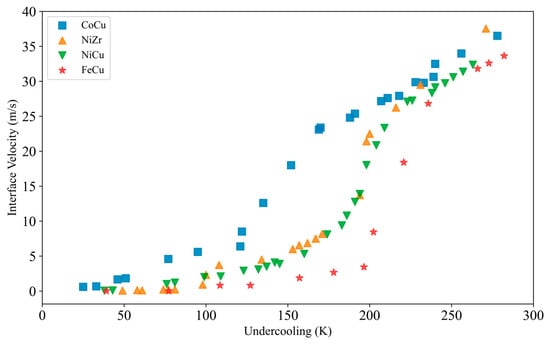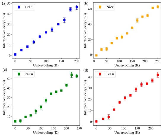 Relationship between calculated interface velocity and undercooling for (a) CoCu, (b) NiZr, (c) NiCu, and (d) FeCu.