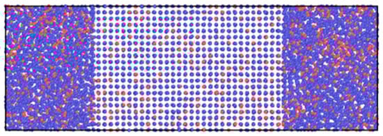 In the construction process of the initial system, in order to avoid any surface effects, periodic boundary conditions were applied in all directions. Four alloy models were constructed by random substitution based on the proportion of experimental alloys. The size was 10a × 10a × 30a (a is the lattice constant for the crystallized phase; please refer to the potential functional files in the Supplementary Materials for specific values), containing 12,000 atoms. In order to create a solid–liquid interface, the upper and lower parts of the system (perpendicular to the Z direction) were melted by equilibrium melting at a temperature higher than the melting temperature, while the middle part was maintained at a temperature lower than the melting temperature. For this purpose, a constant number of atoms, pressure, and temperature (NPT) ensemble was used, and a time step of 1 femtosecond was maintained throughout the entire research process. Subsequently, the entire system was relaxed at the estimated melting point temperature. The conditions under which both solid and liquid phases coexisted were the equilibrium melting conditions (i.e., combinations of pressure, P, and temperature, T). Finally, these solid–liquid simulation cells were used for the subsequent free solidification simulation. A typical starting configuration depicting the projected atomic positions in Co81.2Cu18.8 is shown in Figure 3. In order to obtain the melting temperature, we changed the estimated temperature at intervals of 10k and repeated the above steps, visually observing the data through OVITO until the interface position did not move after a period of relaxation. The calculated melting temperatures of NiCu, CoCu, NiZr, and FeCu were 1400 K, 1500 K, 1690 K, and 1745 K, respectively.