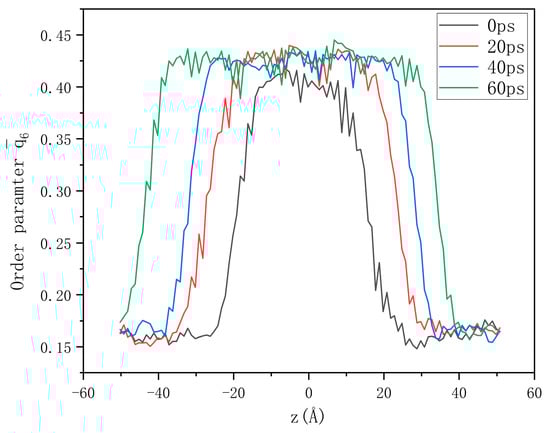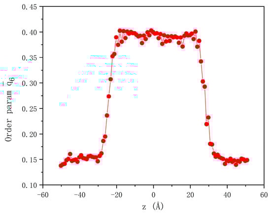 Based on these definitions and functions, the parameter was employed to distinguish between atoms in the solid phase and those in the liquid phase, and to differentiate various crystal structures. The parameter for each atom was calculated over periodic time intervals. The entire system was divided into uniform cells perpendicular to the Z direction, and the average order parameter of all atoms within each cell was computed. Figure 4 shows the order parameters of the CoCu system in its initial state. The parameter value of the crystal-phase region is about 0.4, while that in the liquid-phase region is about 0.15. The order parameter undergoes a sudden change near the liquid–solid interface, and we use this to determine the interface position. Through the acquisition of the interface position at every instant, the interface velocity corresponding to different values of undercooling can be computed according to the temporal variations in the interface position.
