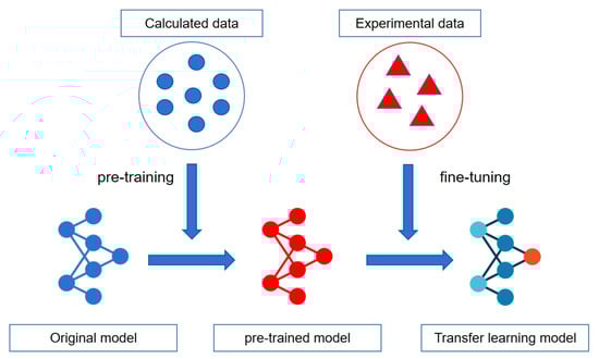 Figure 5 shows the flowchart of the TL framework in this work. The source domain is the data calculated from the MD simulation, and the target domain is the experimental data. To enable the ANN model to learn knowledge and feature–label relationships from the source domain, the ANN is pre-trained in the source domain and then fine-tuned in the target domain to adapt the model to new application scenarios. The purpose is to indirectly learn physical information from MD calculation data and apply this physical information to predict actual experimental data. Compared to the studies in references [38] and [39], this work incorporates MD simulation data and applies the TL model, which can fully explore the feature–label patterns in both MD and experimental data while mitigating the negative effects caused by their discrepancies.