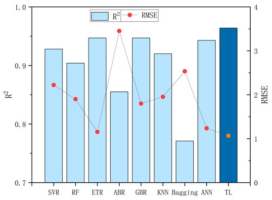 Ten-fold cross-validation of R2 scores and RMSE results using various ML models and TL model.