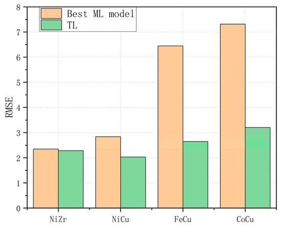 As for the eight models, the optimal models corresponding to the different alloy systems were different. In contrast, the TL model showed the best prediction ability in extrapolation for each alloy. Figure 10 shows the comparison between the results of the TL model and the optimal model among the eight models trained based on pure experimental data. It can be observed that for CoCu and FeCu alloys, the value of R2 increases from 0.635 and 0.77 to 0.93 and 0.961, respectively, and the RMSE values decreases from 7.315 and 6.447 to 3.205 and 2.649, respectively. As for NiCu alloy, there is also a pleasing improvement for the TL model. There is no significant improvement for NiZr alloy, mainly because the GBR model’s prediction performance for it is already very good. This result is primarily attributed to the fact that through the introduction of MD calculations, physical knowledge can be incorporated into the TL model prediction of unknown alloys. It could effectively compensate for the deficiencies inherent in pure data-driven approaches. Therefore, it has been proven that TL models driven by physical information and experimental data have excellent ability in predicting unknown alloy systems without corresponding experimental data. The comparison results and related conclusions regarding the prediction performance of the eight ML models trained on mixed data of computational data and experimental data are as general as in the case of interpolation.