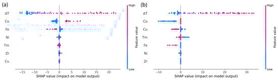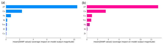 ETR consistently performed well and was used for comparison with the TL model. In order to analyze the overall patterns contained in the current dataset, the ETR model was trained with all the experimental data, and the TL model was trained with the computational data and all the experimental data. Based on the experimental data used in this work, the means of the SHAP absolute values of features, i.e., feature importance of the global interpretability, for the ETR model and TL model are shown in Figure 11. The importance of each element varies, which may be due to the different data volumes of alloys containing that element. It can be observed that for both models, the importance of undercooling (ΔT) is far ahead. The reason why the importance of liquidus temperature (Tm) is not significant may be that the Tm of the alloy systems are relatively close.