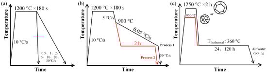 The phase transformation temperatures were measured using a Formastor-FII dilatometer (Fuji Denki Kogyo Co., Ltd., Osaka, Japan). For the continuous cooling transformation (CCT) process, the samples were reheated to 1200 °C at a linear rate of 10 °C/s, held for 180 s to achieve full austenitization, and finally cooled to 50 °C rates ranging from 0.5 to 30 °C/s. A schematic of the process is shown in Figure 1a. For the slow cooling rate process, the sample was first cooled to 900 °C (a fully austenitization state) at a rate of 5 °C/s after homogenization treatment. t was then cooled slowly to 450 °C at a rate of 0.05 °C/s to measure the Ar1 temperature (the austenite-to-ferrite transformation finish temperature during cooling). Finally, the sample was cooled to 50 °C at a rate of 30 °C/s. The process is shown in Figure 1b (Process 1). For the isothermal heat treatment simulation process, the samples were cooled to 550, 450, and 400 °C at a rate of 5 °C/s after homogenization treatment. The samples were then maintained in low-temperature zone for 2 h to study the phase transformation behavior. The samples were finally cooled to 50 °C at a rate of 30 °C/s. This process is shown in Figure 1b (Process 2). The corresponding samples are referred to as I550, I450, and I400, respectively.