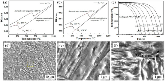 Temperature–dilation curves, CCT curves, and SEM micrographs of the samples subjected to the processes in Figure 1a: (a) 30 °C/s sample; (b) 0.5 °C/s sample; (c) CCT curves; (d) SEM micrograph of 30 °C/s sample; (e) SEM micrograph of the dashed area in (d); (f) SEM micrograph of the 0.5 °C/s sample.