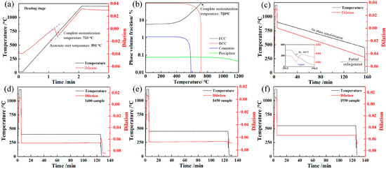 Temperature–dilation curves of the samples subjected to the processes in Figure 1b and the equilibrium phase diagram. (a) SC450 sample during the heating stage; (b) equilibrium phase diagram; (c) SC450 sample; (d) I400 sample; (e) I450 sample; (f) I550 sample.